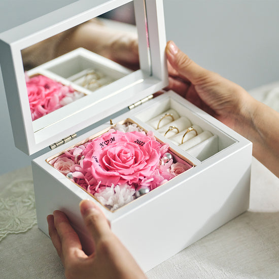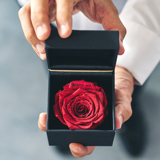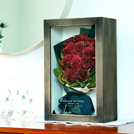 本物の花を加工して長期保存できるようにした、花びらに記念日をプリントできるギフトです。