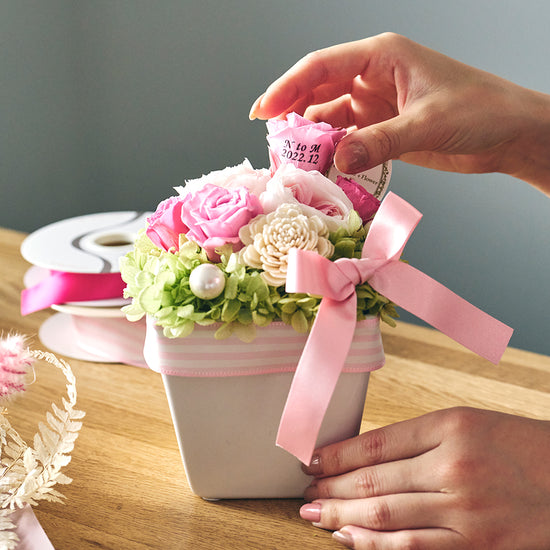 花に記念日がプリントできる生花アレンジメントのギフト。