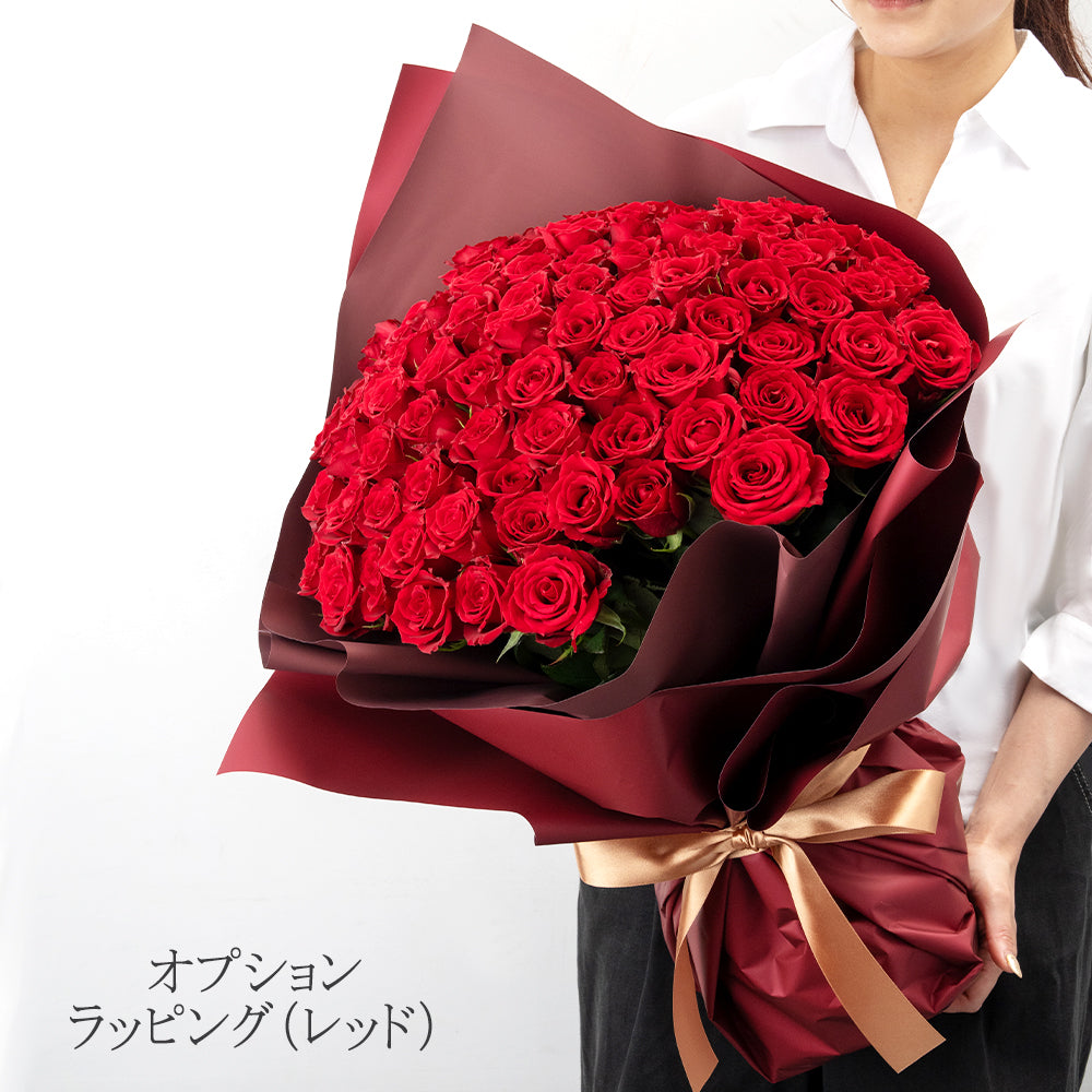 内側には上品な赤、外側にはシックな黒のラッピングペーパーを重ね、光沢のある赤のリボンで仕上げた、高級感のあるラッピングをご用意しています。