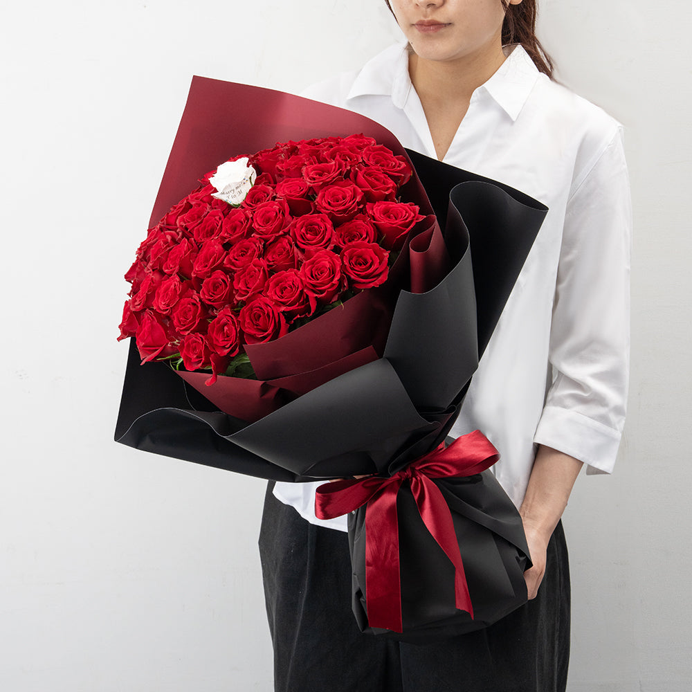 生花バラ50本の花束 は「永遠」という意味があります。2人の出会いが永遠に続くように願いを込めて。