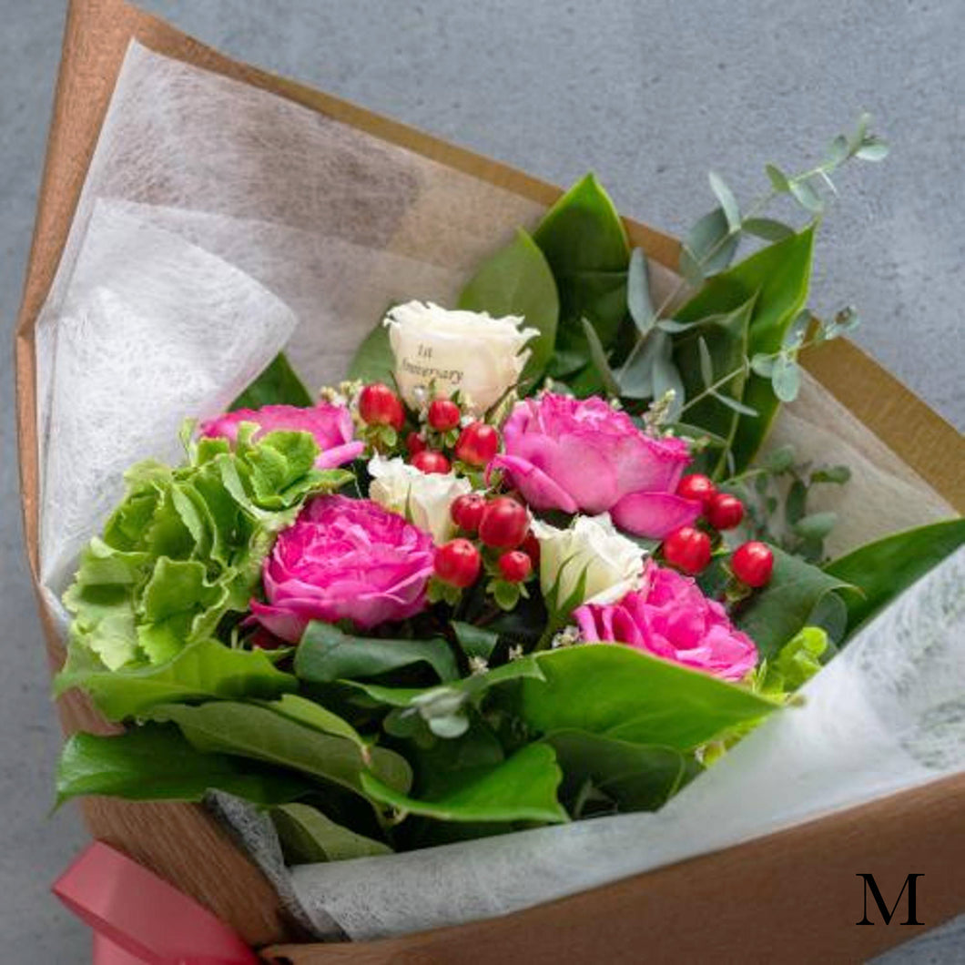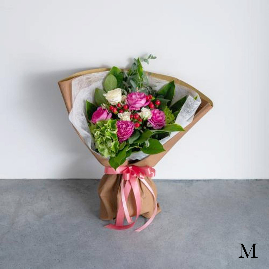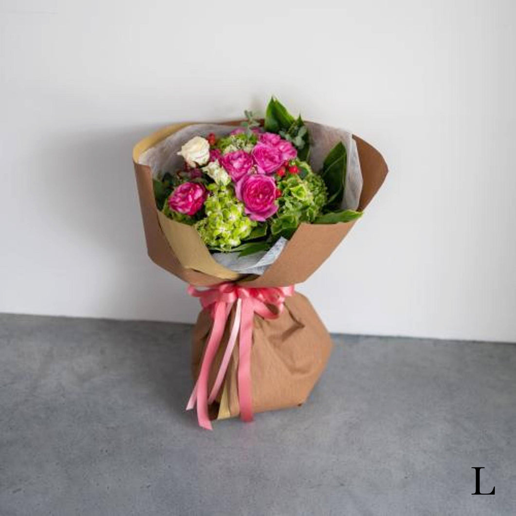 花束は、切り口に保水を施しています。ラッピングペーパーで華やかな印象に仕上げています。