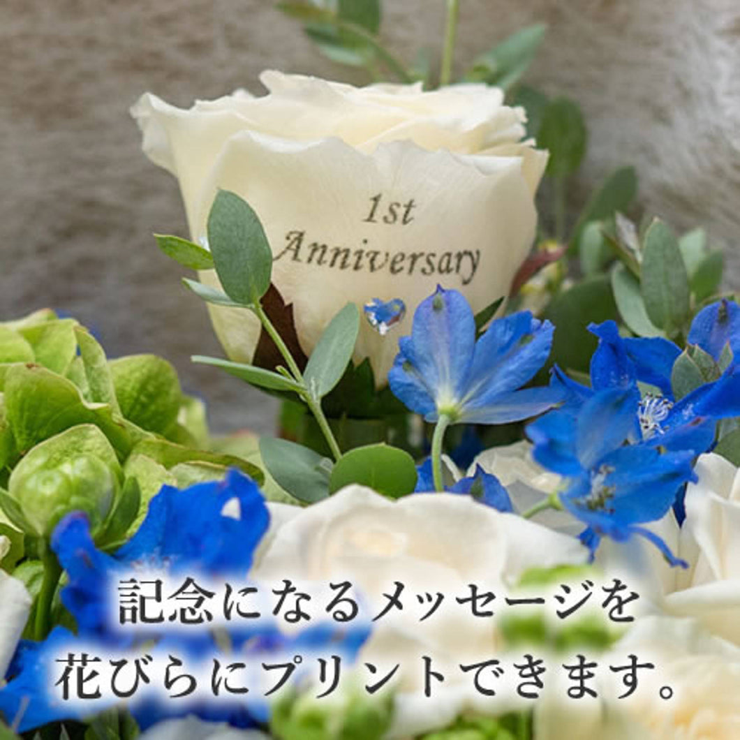 メッセージをお入れするバラはプリザーブドフラワーになります。長期間、美しいままを保つため、それ以外の花や部分(茎や葉など)は、アーテフィシャルフラワー(フェイク)を使用している場合があります。